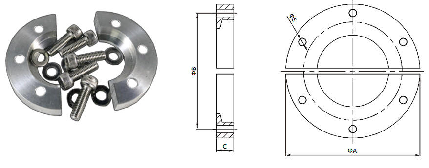 ISO-KF ပစ္စည်းများကို နှစ်ခုသော ဖလံခ်များ၏ အလယ်တွင် စီးထားသော စင်တာရင့်ကို ထည့်ပြီးနောက် ဖလံခ်ကို ဝိုင်းထားသော ကလမ့်ဖြင့် တားဆီးကာ တပ်ဆင်ပါသည် (ပုံ ၂ ကိုကြည့်ပါ)